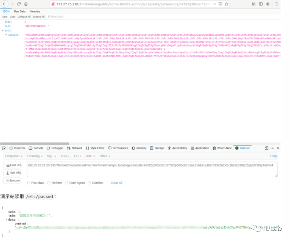 有一个允许的列表:configpublic/staticpublic/router.phppublic/index.phpapp/adminapp/wechat也就是说$name必须要不是database.php且要在允许列表内的文件才能够被读取,先绕过安全列表的限制,比如读取根目录的1.txt,只需要传入:public/static/../../1.txt而database.php的限制在Linux下应该是没办法绕过的,但是在Windows下可以透过"来替换.,也就是传入:public/static/../../config/database"php对应encode()后的结果为:34392q302x2r1b37382p382x2r1b1a1a1b1a1a1b2r33322u2x2v1b2s2p382p2q2p372t0y342w34br